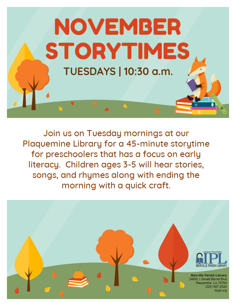 Join us on Tuesday mornings at our Plaquemine Library for a 45-minute storytime for preschoolers that has a focus on early literacy. Young children will hear stories, songs, and rhymes along with ending the morning with a quick craft.